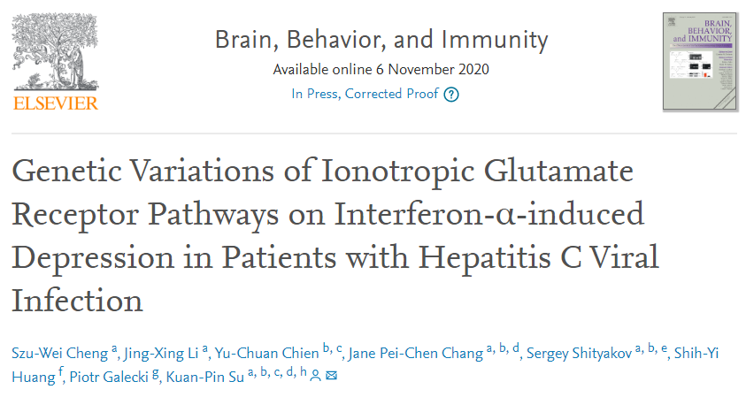 由台灣身心醫學研究團隊發表在國際期刊(Brain, Behavior, and Immunity)的研究“離子型麩胺酸受體路徑之基因變異對C型肝炎病患罹患甲型干擾素誘發憂鬱症的影響”(Genetic Variations of Ionotropic Glutamate Receptor Pathways on Interferon-α-induced Depression in Patients with Hepatitis C Viral Infection)是全世界第一個在神經傳導物麩胺酸 (Glutamate) 受體上的憂鬱症基因研究,引起國內外精神醫學界廣泛的關注。