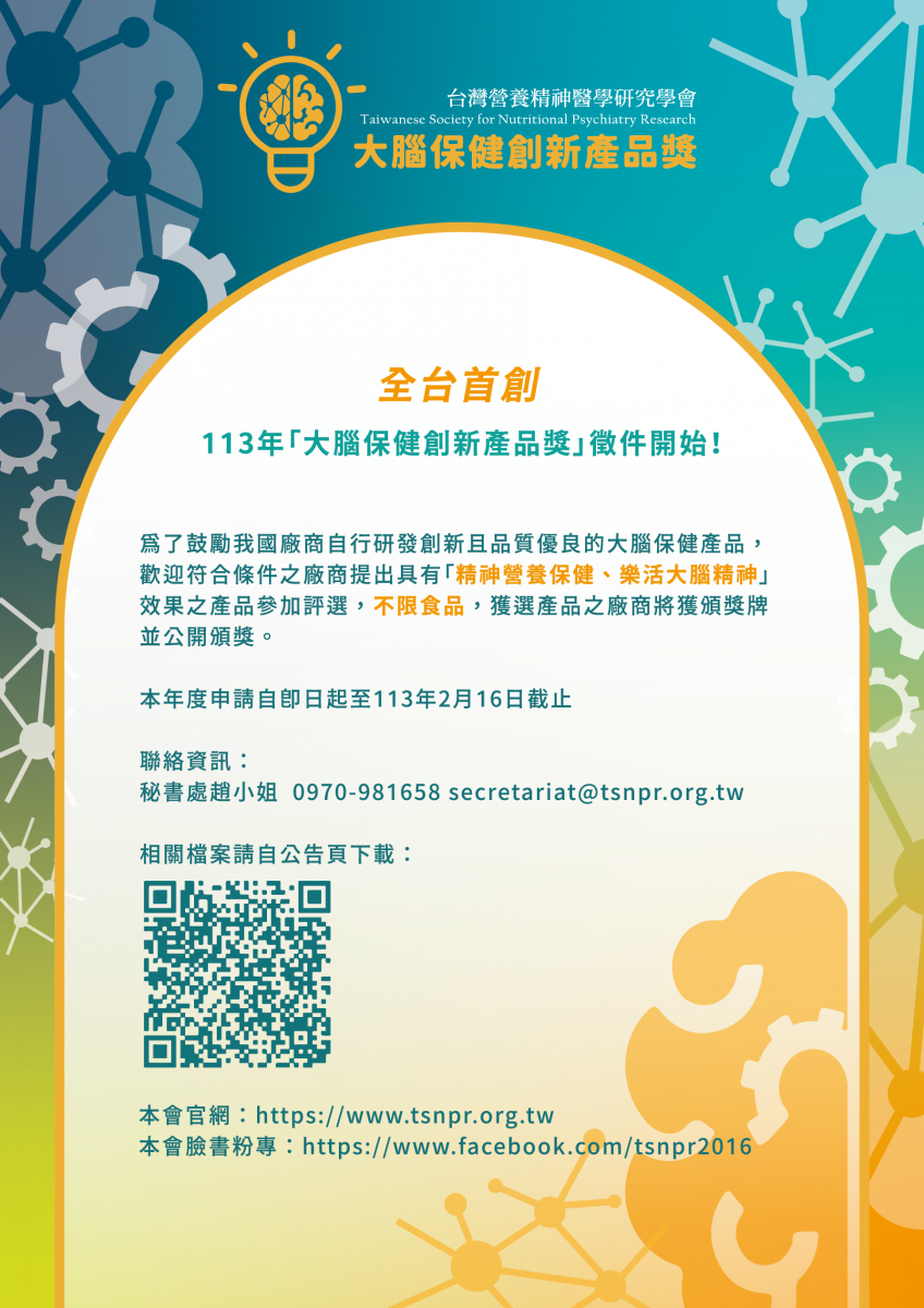 台灣營養精神醫學研究學會(本會)今年(113)首創「大腦保健創新產品獎」甄選,不論是食品或非食品,只要具有「精神營養保健、樂活大腦精神」效果之產品,皆歡迎參加甄選,本年度徵件至113年2月16日中午止(線上申請),各界廠商務必把握優質大腦保健創新產品露出的最佳機會!