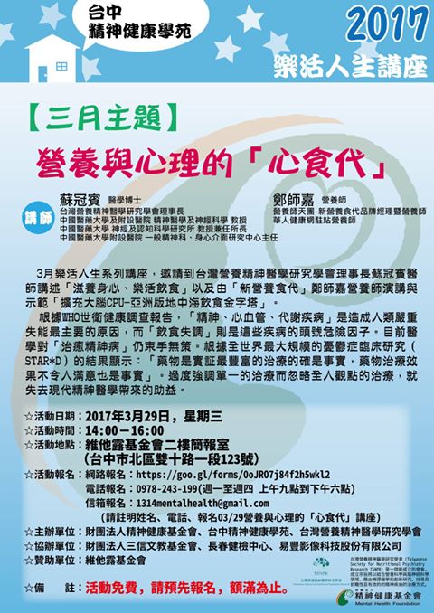 台中精神健康學苑謹訂於3月29日(三)假台中維他露基金會舉辦樂活人生講座,主題為營養與心理的「心食代」。講座中將邀請精神科蘇冠賓醫師醫師與「新營養時代」的營養師團隊分享營養新觀念,開啟大腦飲食記錄的平台,創建食物營養圖書館。台中精神健康學苑致力於提倡「保養頭腦,優築生命」理念,定期舉辦系列性的讀書會及講座活動,歡迎志工民眾及對營養精神醫學實務應用有興趣的人士前往聆聽。報名連結請點入。