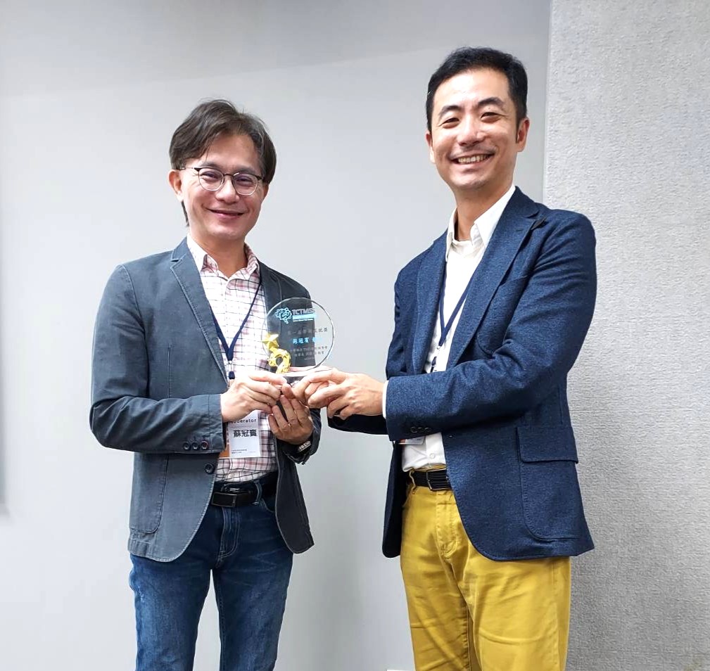 蘇冠賓教授(左)榮獲台灣臨床TMS腦刺激學會學術成就獎,由該會洪敬倫理事長(右)頒發獎座。
