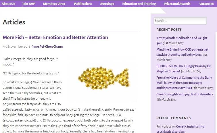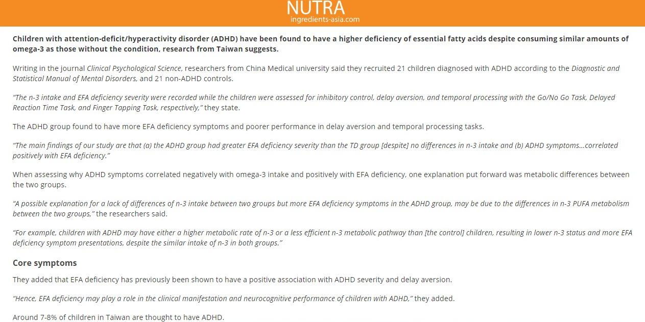 營養醫學在注意力不足過動症 (Attention Deficit Hyperactivity Disorder; ADHD) 的治療與機轉有前瞻性的突破。張倍禎醫師2016年底在Clinical Psychological Science期刊中發表了n-3不飽和脂肪酸 (PUFAs) 與ADHD的關聯性研究,此研究獲得國際學術界的矚目並接連獲關注與報導,包括英國藥理學會British Association for Psychopharmacology (BAP) 以及NutraIngredients-Asia.com (NUTRA)等。本研究指出ADHD的症狀與體內的必需脂肪酸 (Essential fatty acids, EFA) 的不足有關 ,也就是說人體內的EFA缺乏與ADHD臨床症狀的嚴重程度具有正向相關,而在與衝動控制有關的認知功能表現上則具負向相關。儘管EFA (如n-3) 在大腦中認知功能的機轉中所扮演的角色仍需要更多的研究,但發炎假說仍是目前最具有前瞻性的研究方向,我們期待有更多的臨床研究能進一步佐證EFA (如n-3) 對注意力不足過動症 認知功能上的幫助。