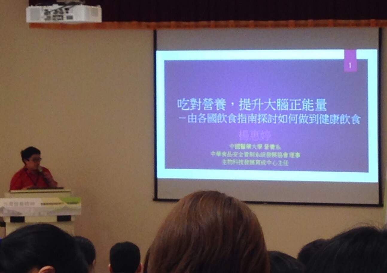 演講的下半場由楊副教授接棒,在營養界有著傑出表現的楊老師,熱切的期待營養醫學可以站在一個預防性醫學的角度成為醫療的一環。演講中對各國的飲食指南進行比較與建議,並以研究團隊的成果跟大家分享以「拍照」來記錄飲食,提高對於飲食印象及記錄率,喚起腦部對於飲食的意識。楊老師也呼籲大家不要偏廢某一種食物,飲食攝取首重均衡多元,還幽默的說:「談感情要專一,但吃東西要劈腿」。此外,也說明飲食選擇首重營養素來源,勝過熱量的控制,例如學習如何挑選優質蛋白質及好油等等。最後楊老師也介紹由她所成立的新營養食代營養師團隊,此團隊積極將營養師的專業知識主動傳播給一般大眾,更發展出實用的APP幫助大眾將營養的知識與習慣真正融合到日常生活,建立健康的生活型態。