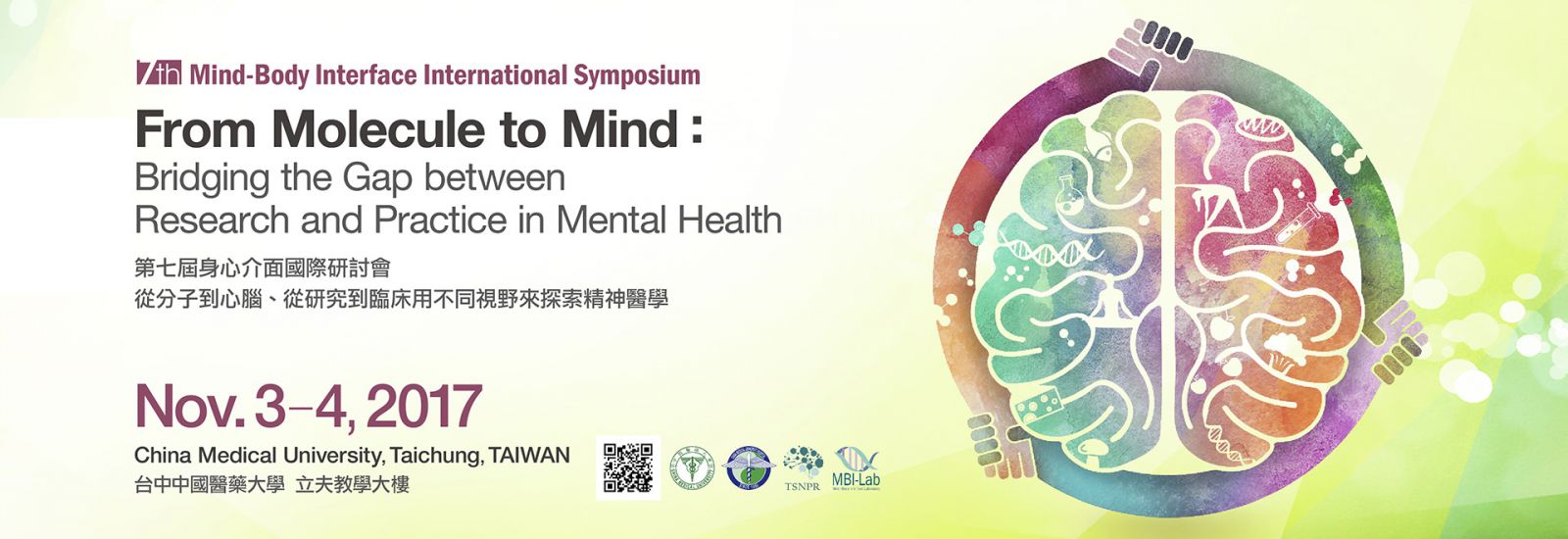 第七屆身心介面國際研討會:從分子到心腦、從研究到臨床用不同視野來探索精神醫學(7th Mind-Body Interface International Symposium: Bridging the Gap between Research and Practice in Mental Health) 將於2017年11月3-4日於中國醫藥大學立夫教學大樓舉辦,本屆研討會邀請來自美、俄、加、德、中、日、澳門等享譽國際的學者及研究團隊以大腦神經精神醫學相關的主題進行交流與分享,主題多元內容精采,包括免疫醫學、代謝疾病、分子醫學、營養醫學研究、影像醫學、健康促進、疾病管理及公衛流病等在精神醫學上的應用與研究,讓您一窺精神醫學的最新研究發展!