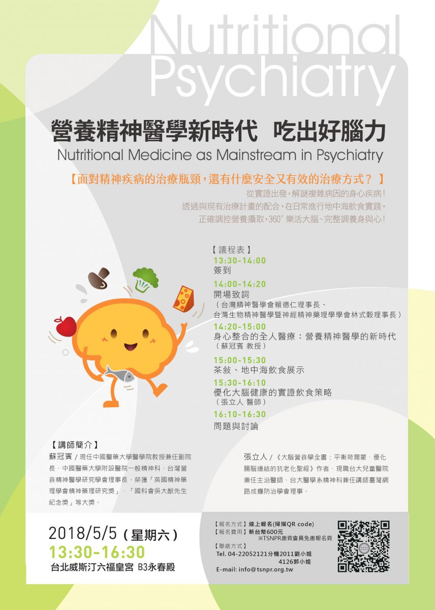 於2016年成立的台灣營養精神醫學研究學會 (Taiwanese Society for Nutritional Psychiatry Research; TSNPR) 致力於結合營養科學與腦神經科學領域,從致病機轉中找尋前瞻的整合治療選項。透過與現有治療計畫的配合,增加適當的營養素補充,並從日常進行地中海飲食實踐,完整滋養身與心!