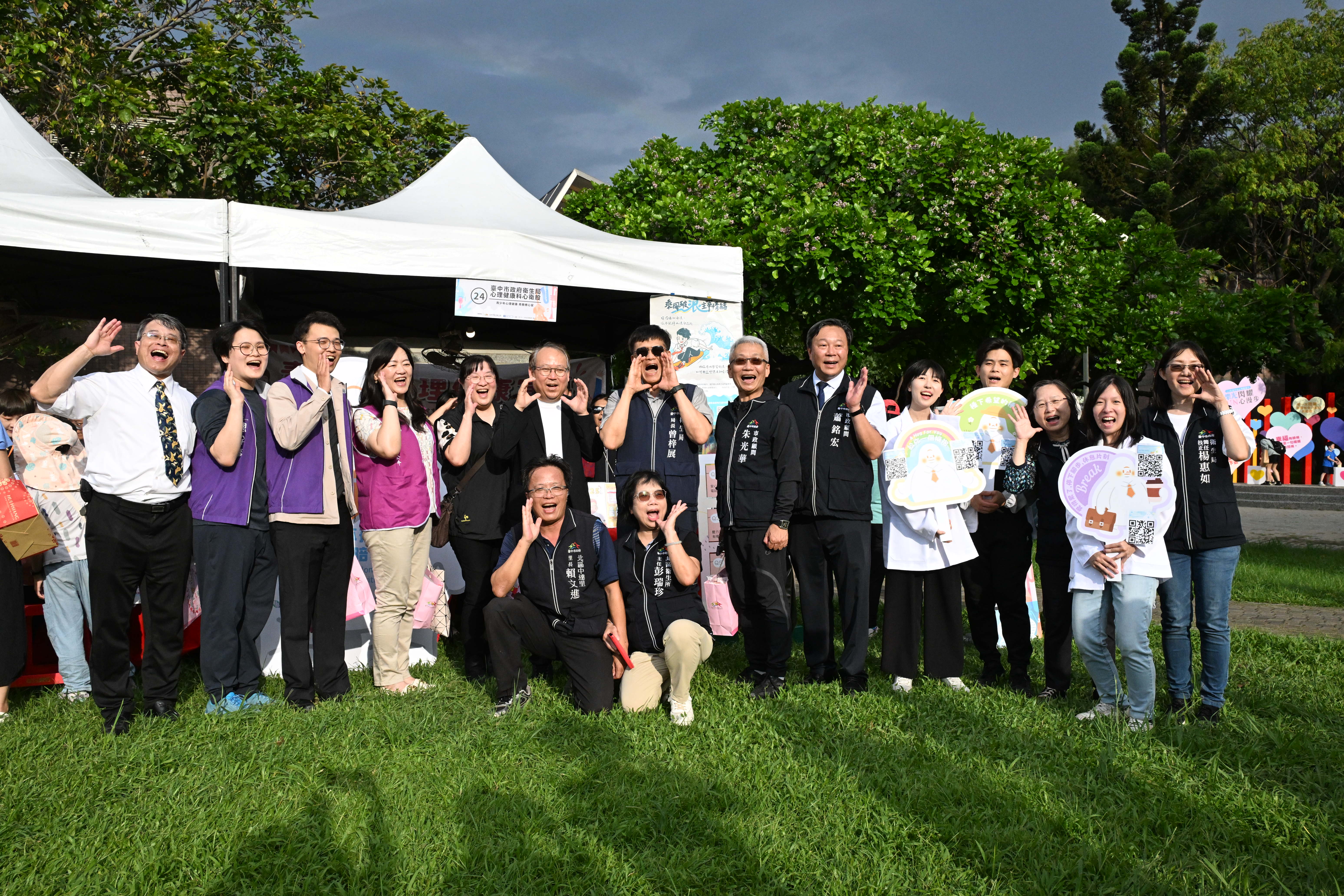 台中市政府衛生局9/20在北區中正公園舉辦「樂光閃耀FUN心漫步-114年台中市心理健康月」活動,台中衛生局 曾梓展局長 (中)及各區長官與線上篩檢推廣同仁一起合影