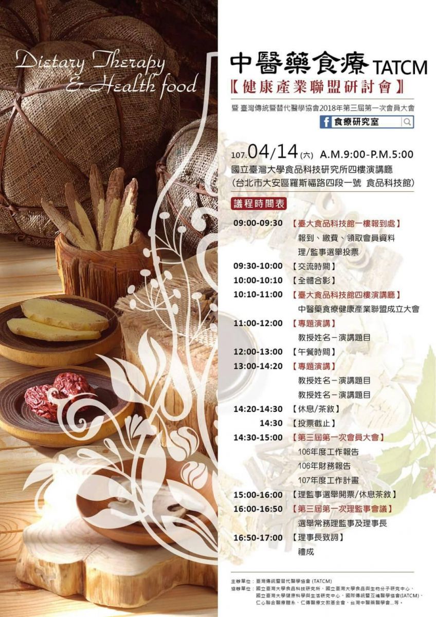 由臺灣傳統暨替代醫學協會(Taiwan Association for Traditional and Complementary Medicine)所主辦的「中醫藥食療健康產業聯盟研討會」將於107年4月14日於舉辦並召開會員大會。