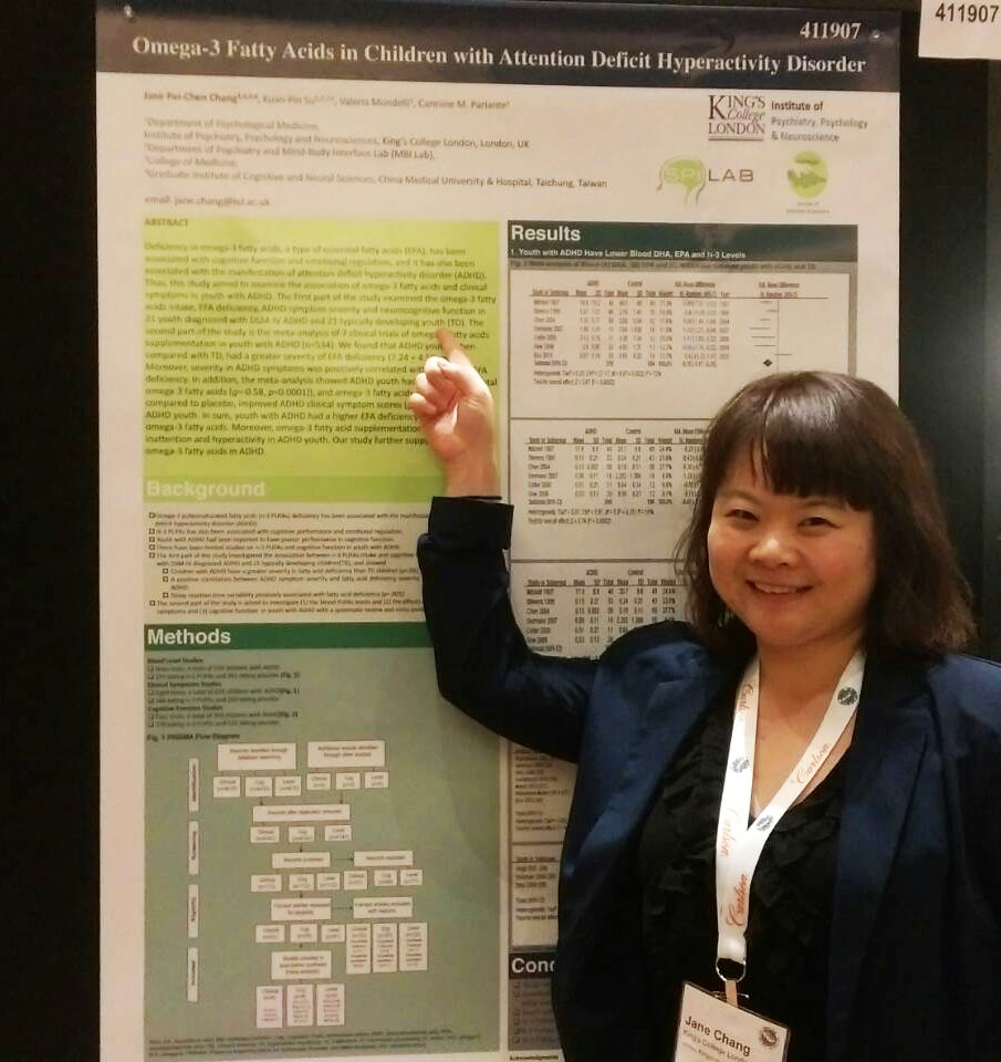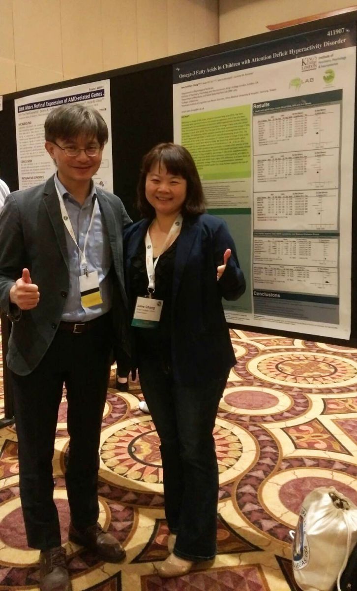 更值得慶賀的是本學會的理事張倍禎醫師榮獲大會年輕學者獎項殊榮 (New Investigator Award),獲獎的論文主題為「Omega-3 Fatty Acids in Children with Attention Deficit Hyperactivity Disorder」。得獎論文第一部分主要是探討多元不飽和脂肪酸(polyunsaturated fatty acids, PUFAs)在注意力不足過動症(ADHD)之延宕厭惡(delay aversion)和時間處理 (temporal processing) 所扮演的角色;第二部分是探討Omega-3脂肪酸的補充與其臨床症狀和認知功能之改善在注意力不足過動症孩童研究的總和分析(meta-analysis)結果。