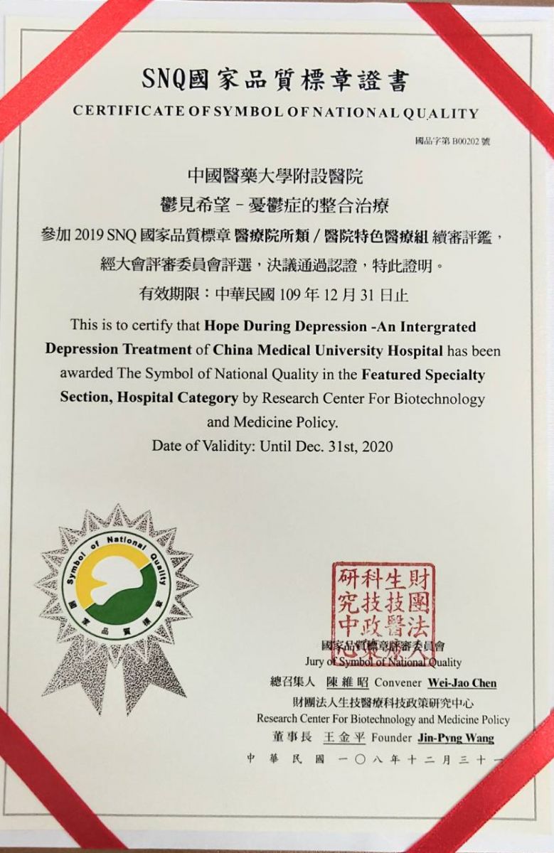 恭喜~~蘇冠賓理事長帶領臨床與研究團隊共同推動之「鬱見希望─憂鬱症的整合治療」再次獲得SNQ國家品質標章肯定