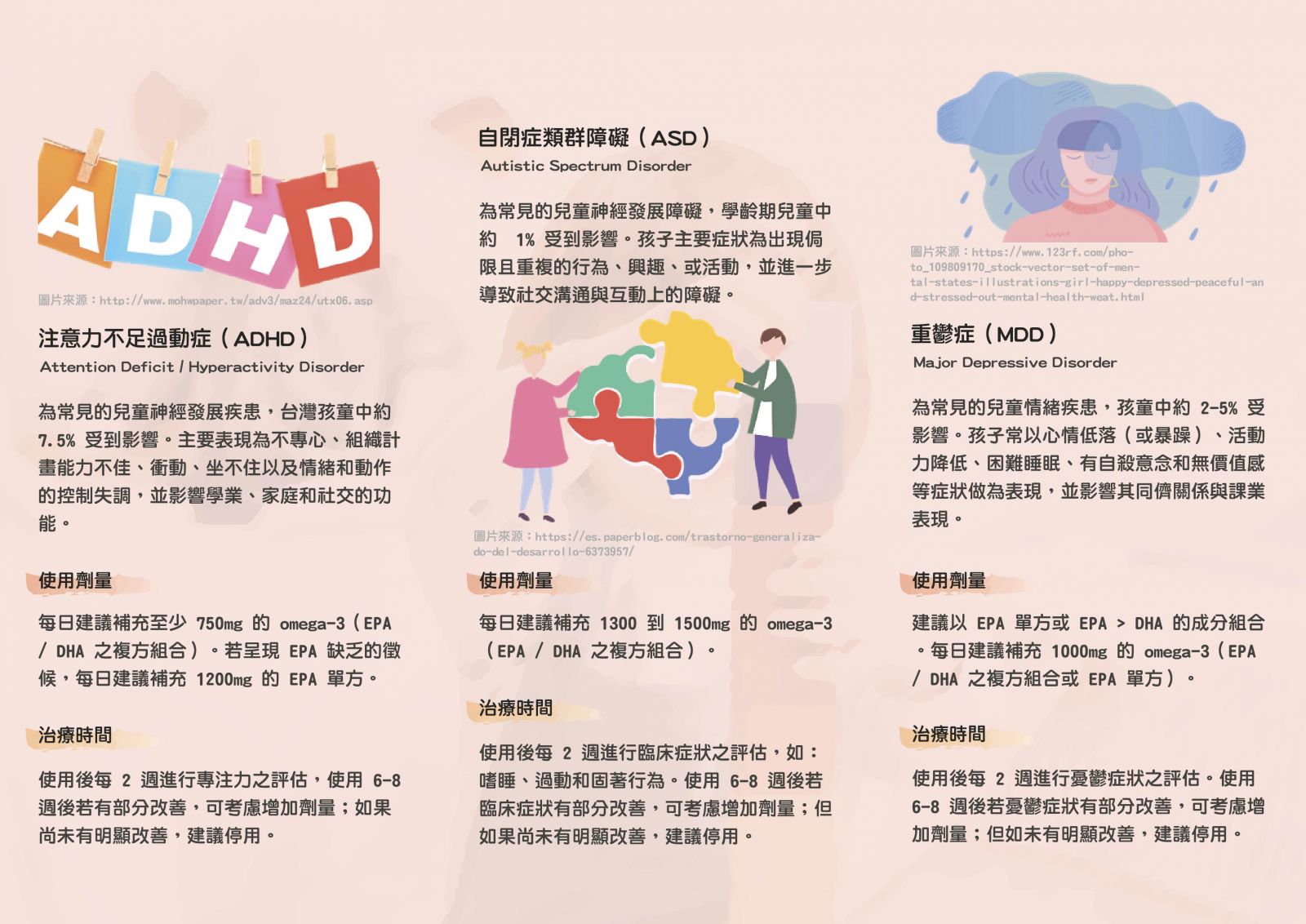 - 自閉症 (Autistic Spectrum Disorder, ASD)劑量: 每日建議補充1300mg-1500mg的omega-3 (EPA/DHA之複方組合)。