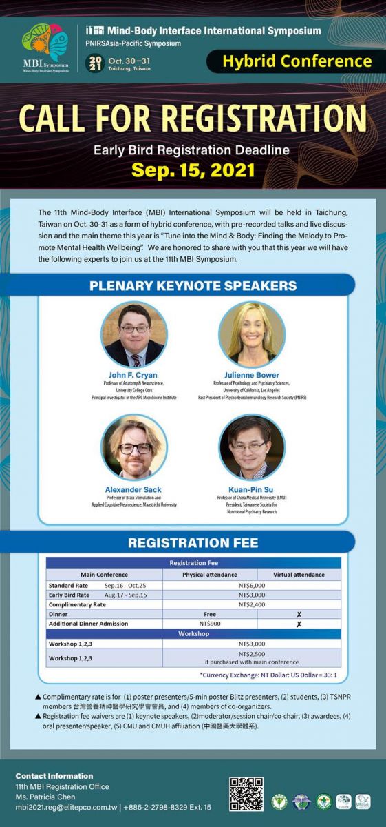 由台灣營養精神醫學研究學會(TSNPR)、身心介面研究中心(MBI Lab)主辦的第十一屆身心介面國際研討會,(11th Mind-Body Interface International Symposium) 謹訂於110年10月30日至31日在台中裕元花園酒店舉辦,線上會議 (hybrid meeting) 同步舉行。本屆研討會主題為“Tune into the Mind & Body: Finding the Melody to Promote Mental Health Wellbeing”,用身與心的和弦奏出大腦精神健康的旋律。